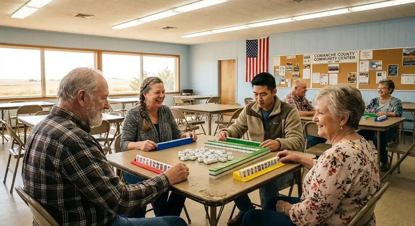 Given the county's vast plains and sparse population, mahjong enthusiasts often rely on close-knit social networks rather than public clubs. Games are typically hosted in private residences, meaning the scene thrives on word-of-mouth invitations. This fosters an intimate atmosphere where players from Coldwater and Protection frequently travel to maintain consistent weekly rotations among their small rural groups.