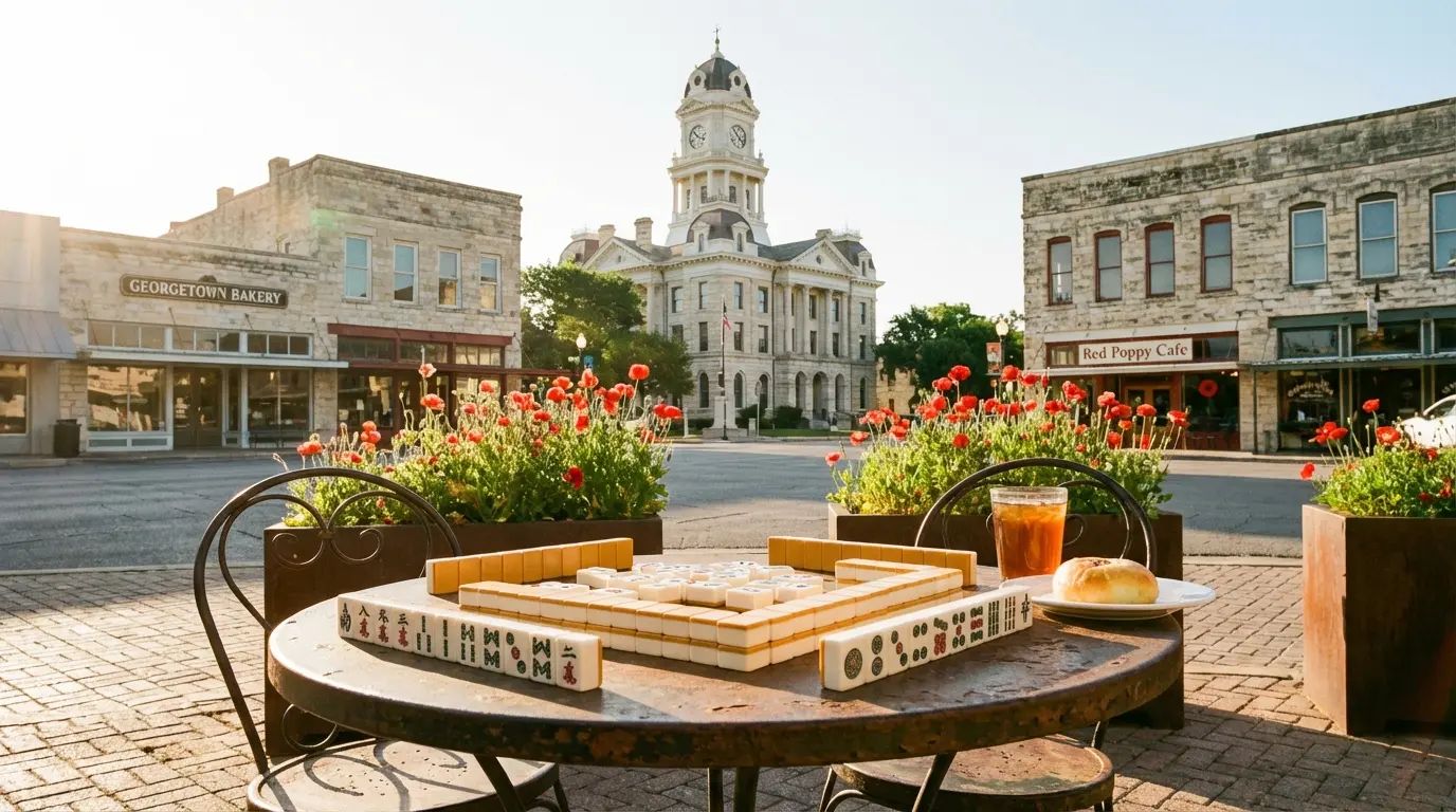 Sun City residents and Williamson County newcomers gather beneath the oak trees of Georgetown to sharpen their American Mahjong skills. This seat of local government maintains a polished yet approachable atmosphere where the historic courthouse square sets a tempo for thoughtful strategy. Active retirees and social explorers congregate here, drawn to the intersection of traditional Texas hospitality and the mental agility required for high-level tile play. Games take root in neighborhood clubhouses and sun-drenched cafe corners across Central Texas. Boutique social gatherings and open sessions in community halls replace formal gaming centers, allowing groups to choose between quiet private tables and lively public circles. These spaces foster a culture of focused play where the environment—from breezy backyard patios to refined country club parlors—dictates the energy of the afternoon. Beginners find ready mentors among the instructors who specialize in the American style, while veteran players organize socials to test complex defensive maneuvers. This circle of neighbors values mentorship over gatekeeping, helping new arrivals find a permanent seat. Those seeking a mix of festive parties and serious tactical sessions will find this area provides a consistent rhythm of play for every skill level.